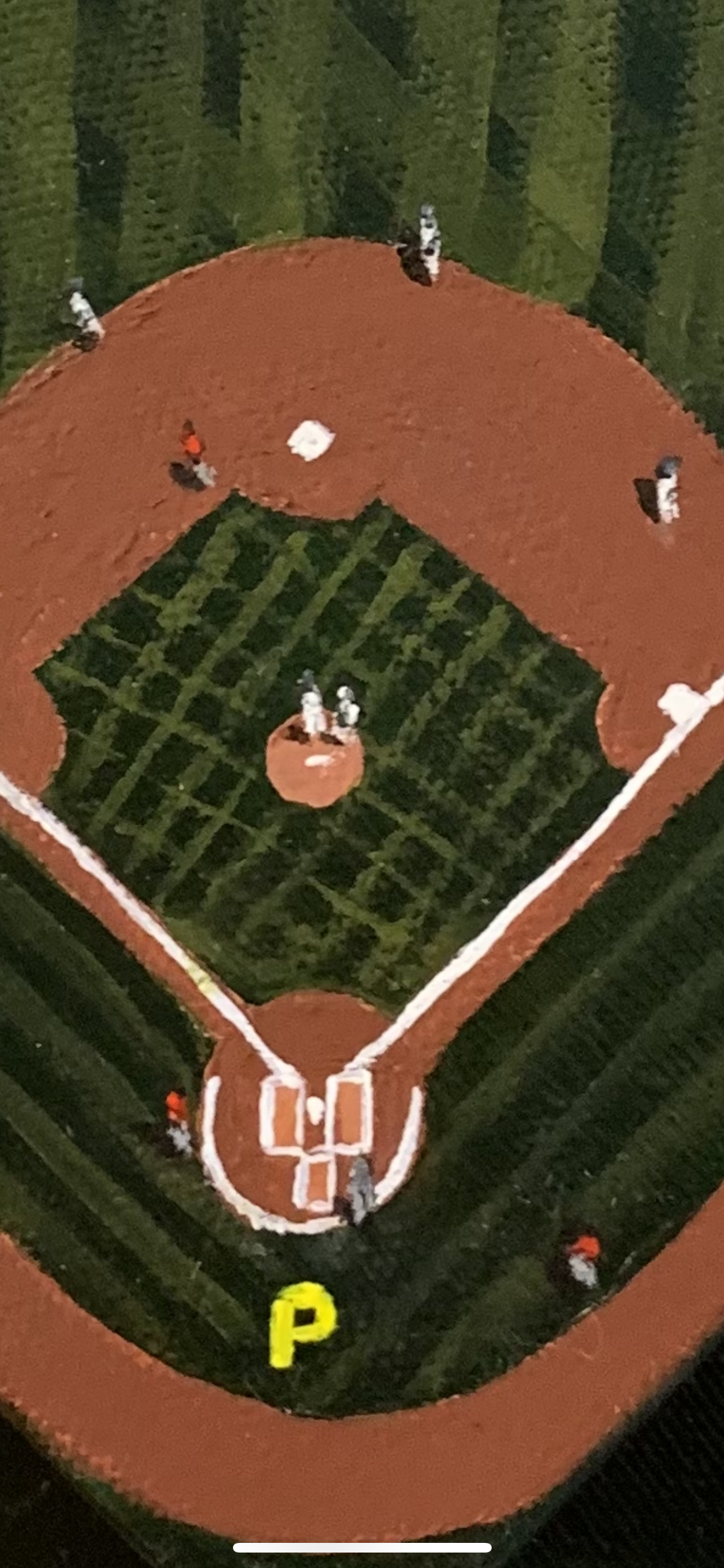 This is painting is a 6x6” canvas mounted on a 12x12” canvas, each with a 1.5” depth. The top canvas shows the team in an active game. The four sides of the top canvas are also detailed: The PNC Park sign which can be seen outside the park, the Clemente Wall from the park’s right field, a bat and ball, and the word “Pirates”.