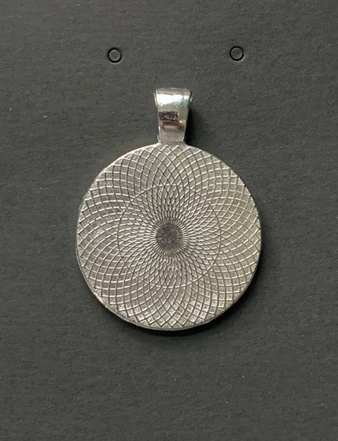 The metal alloy pendant measures approximately 1 inch in size with a domed glass cabochon cover. The beautiful 18" stainless steel chain is fade-proof and nickel-free.